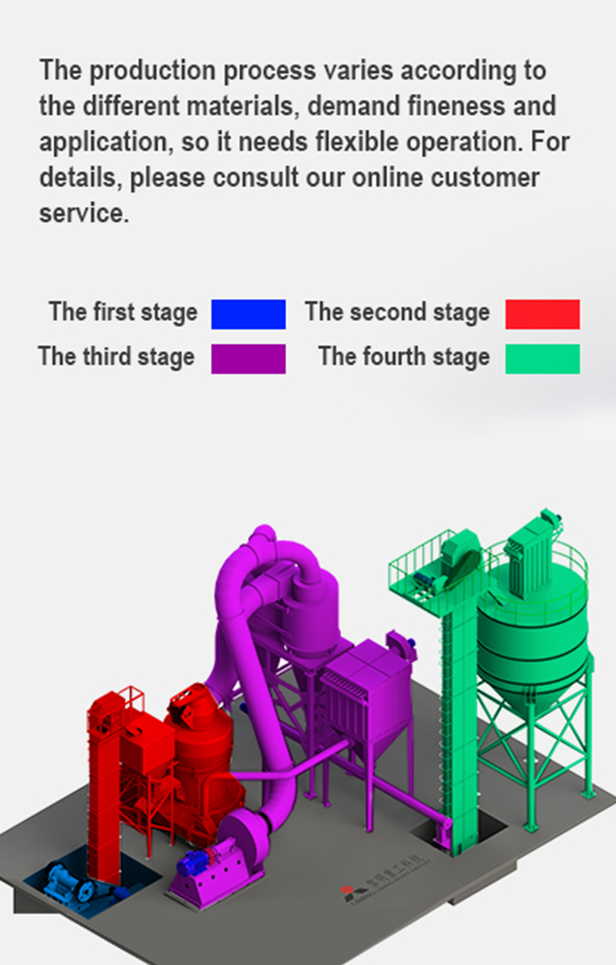 The small pieces of Calcite after crushed are sent to the buffer silo by the bucket elevator, then goes into the grinding chamber of the mill by the vibrating feeder before grinding mill.