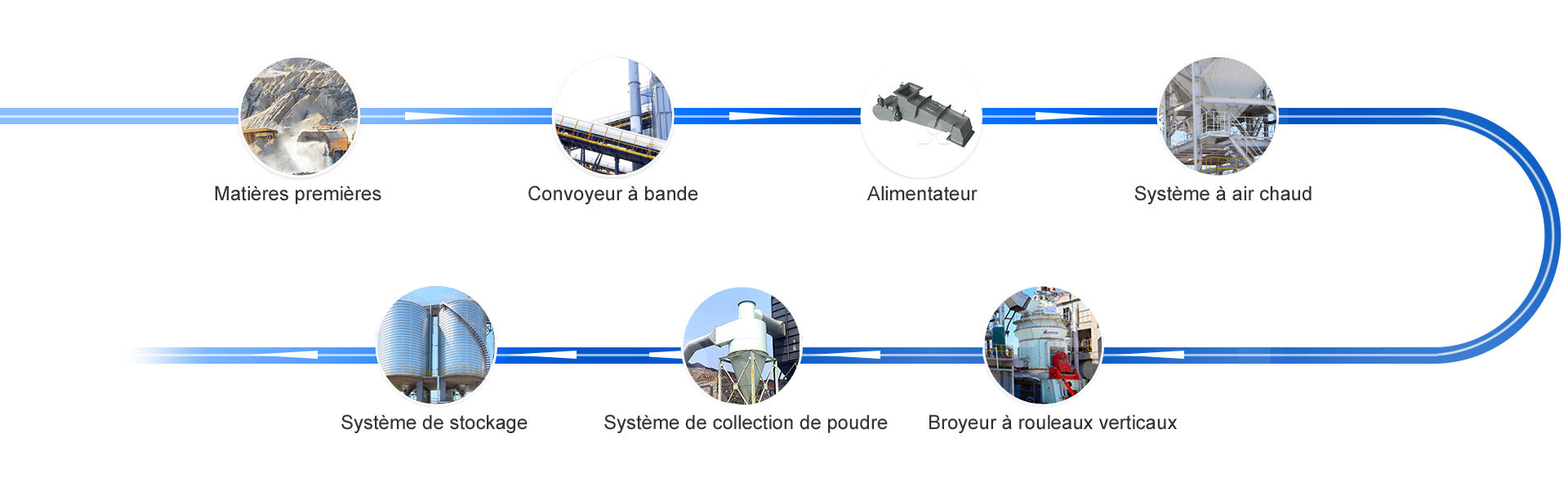 Le processus central — « broyage, séparation, collecte, homogénéisation » — forme une boucle en circuit fermé, permettant une production continue, efficace et de haute qualité.